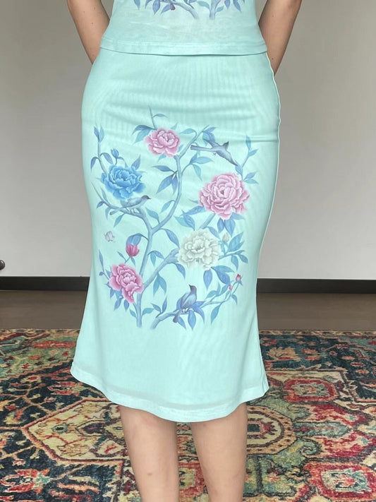 Neo Chinese style cheongsam silhouette paired with artist collaborations of floral patterns.