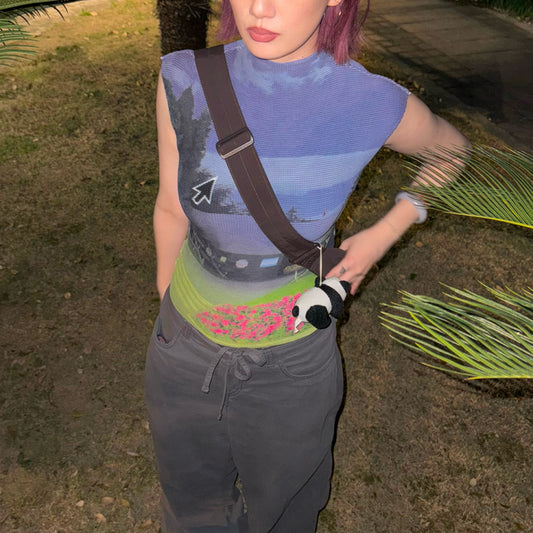 Kitty Print Pleated Black Tank Top