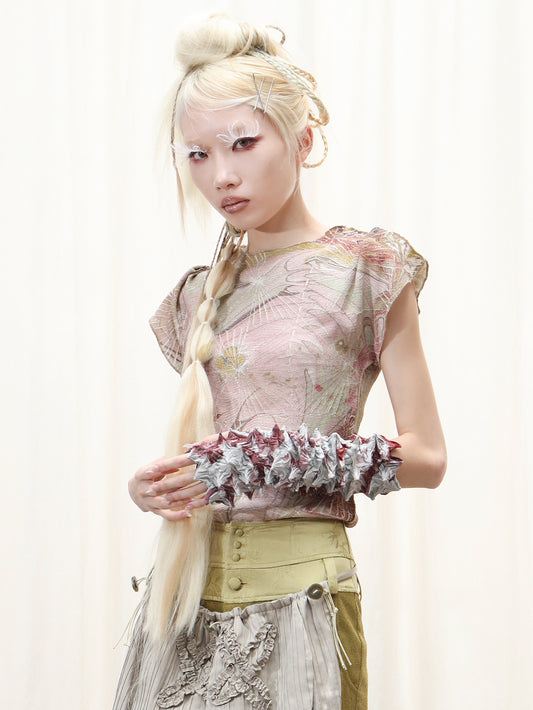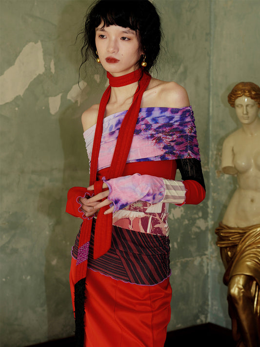 Off-Shoulder Floral Parrot Mesh Maxi Dress