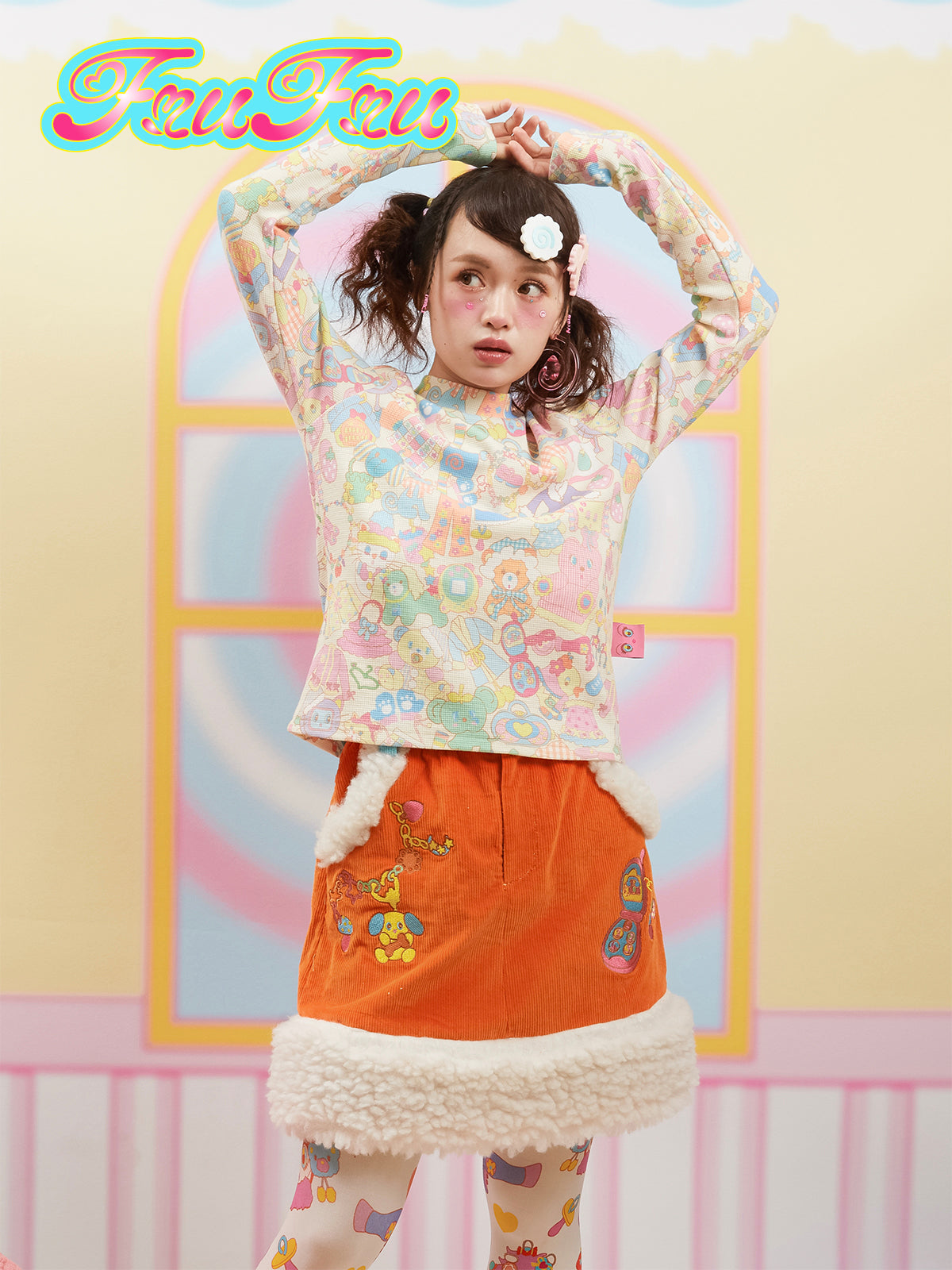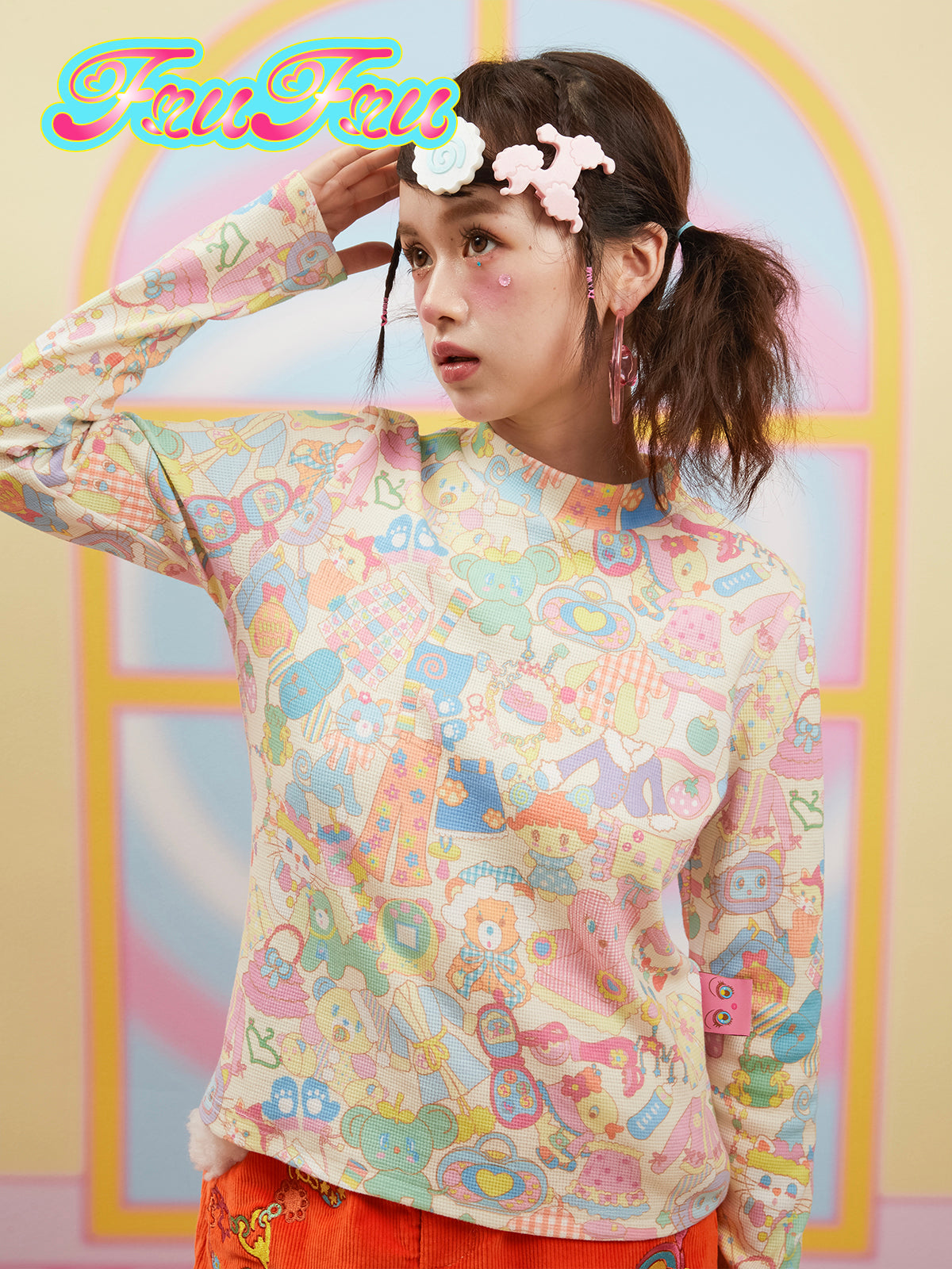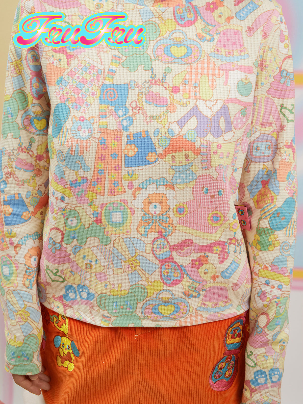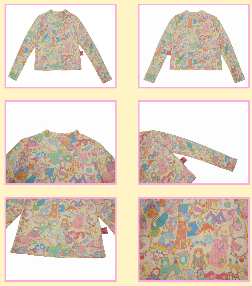This frufru Kawaii Cartoon Sweatshirt features multiple kawaii toy graphics, comfortable cotton fabric, ideal for the base layer of a harajuku inspired outfit.