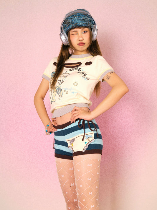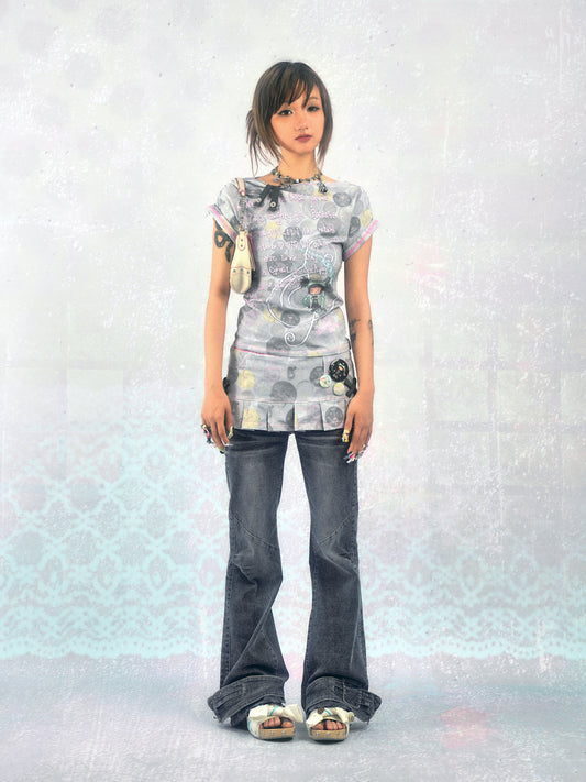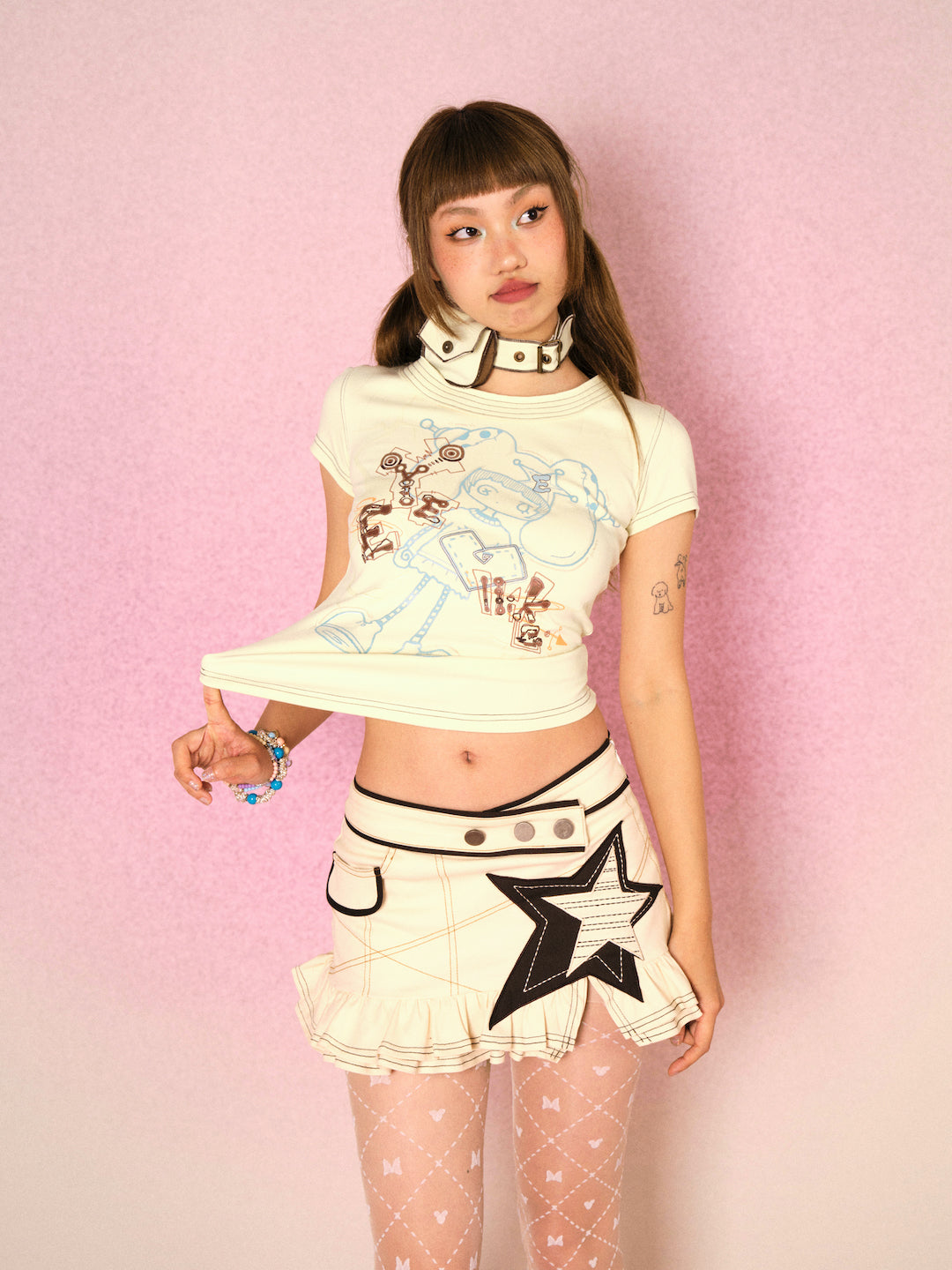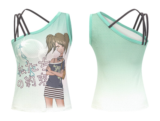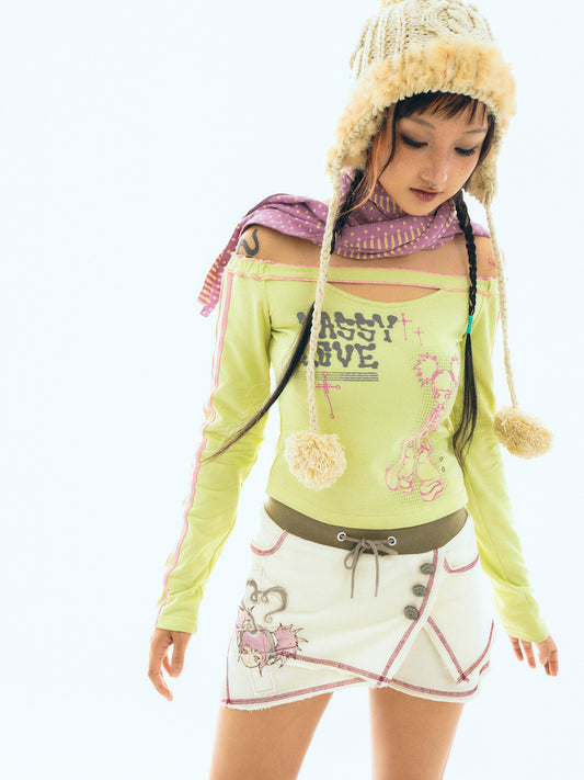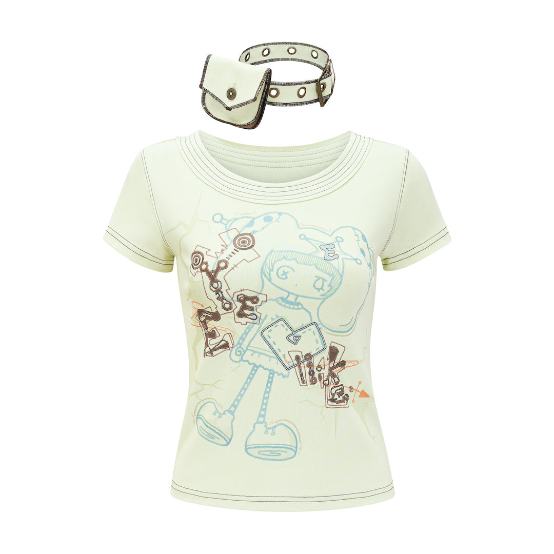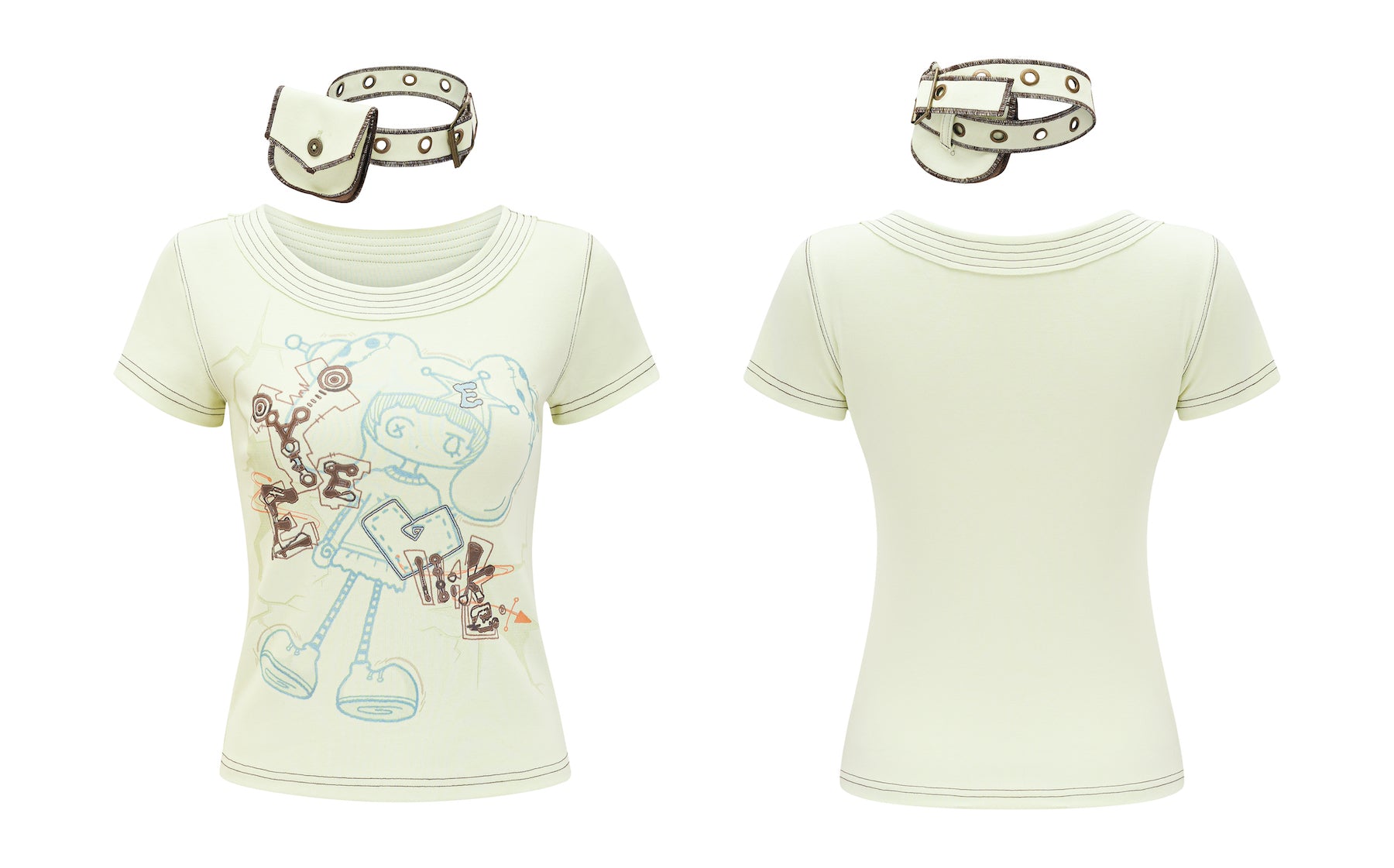 This Schizo Anime Girl Pocket Collar Shirt from eyeellike's SS23 collection features a y2k style girl graphic on the chest printed onto a pale green 100% cotton fabric. The unique pocket collar makes it extra fun for a fit.