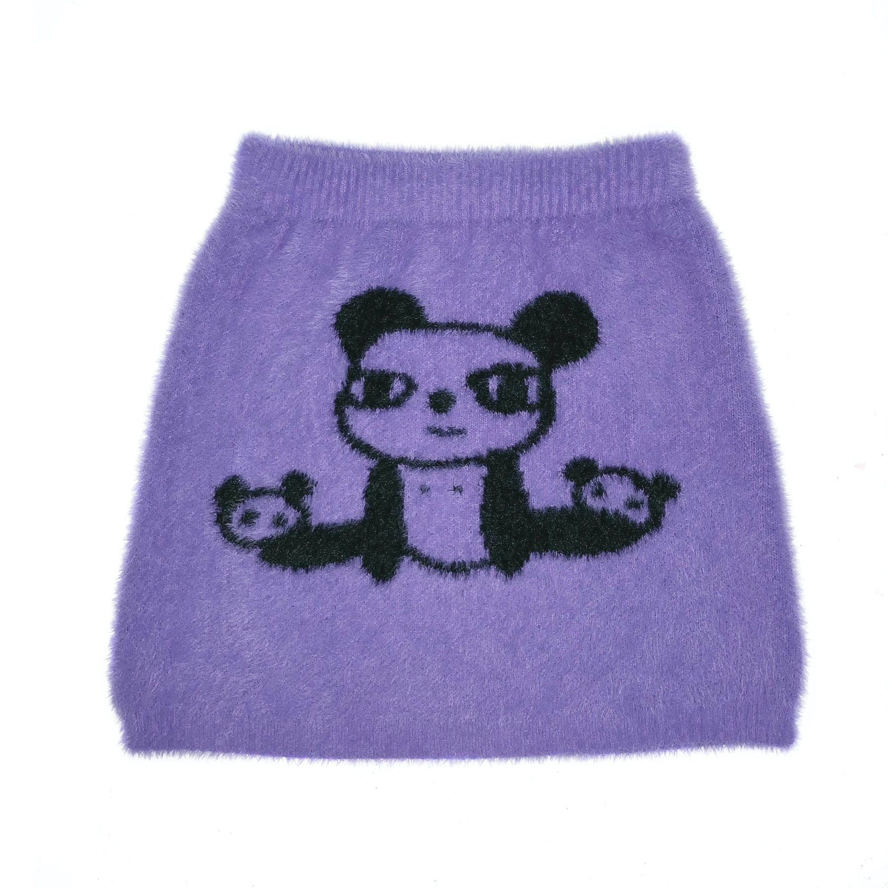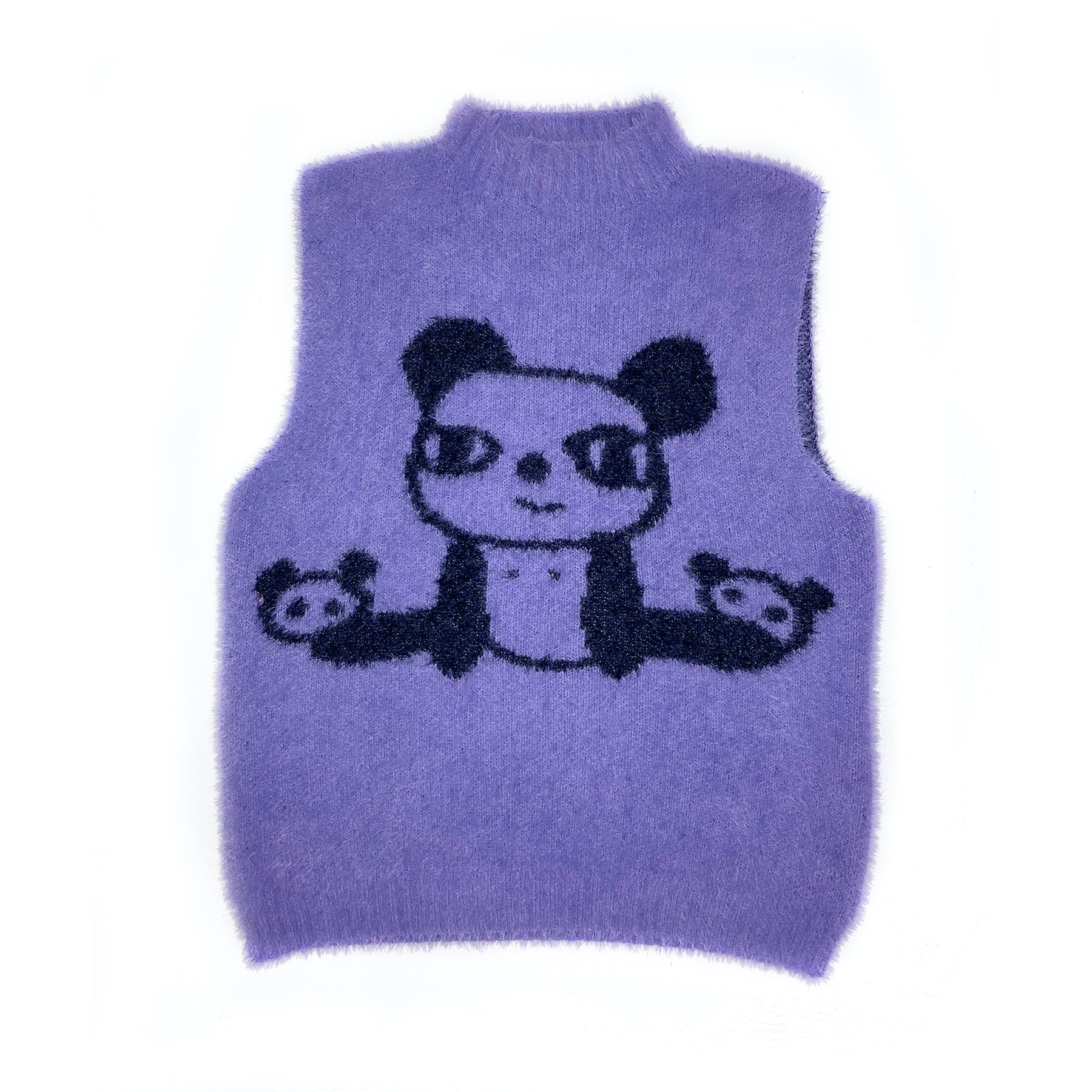 This kawaii panda set by Transparent Cave features cute panda graphics, a mock neck sleeveless design, and soft knit fabric in shades of lavender, berry, and black.